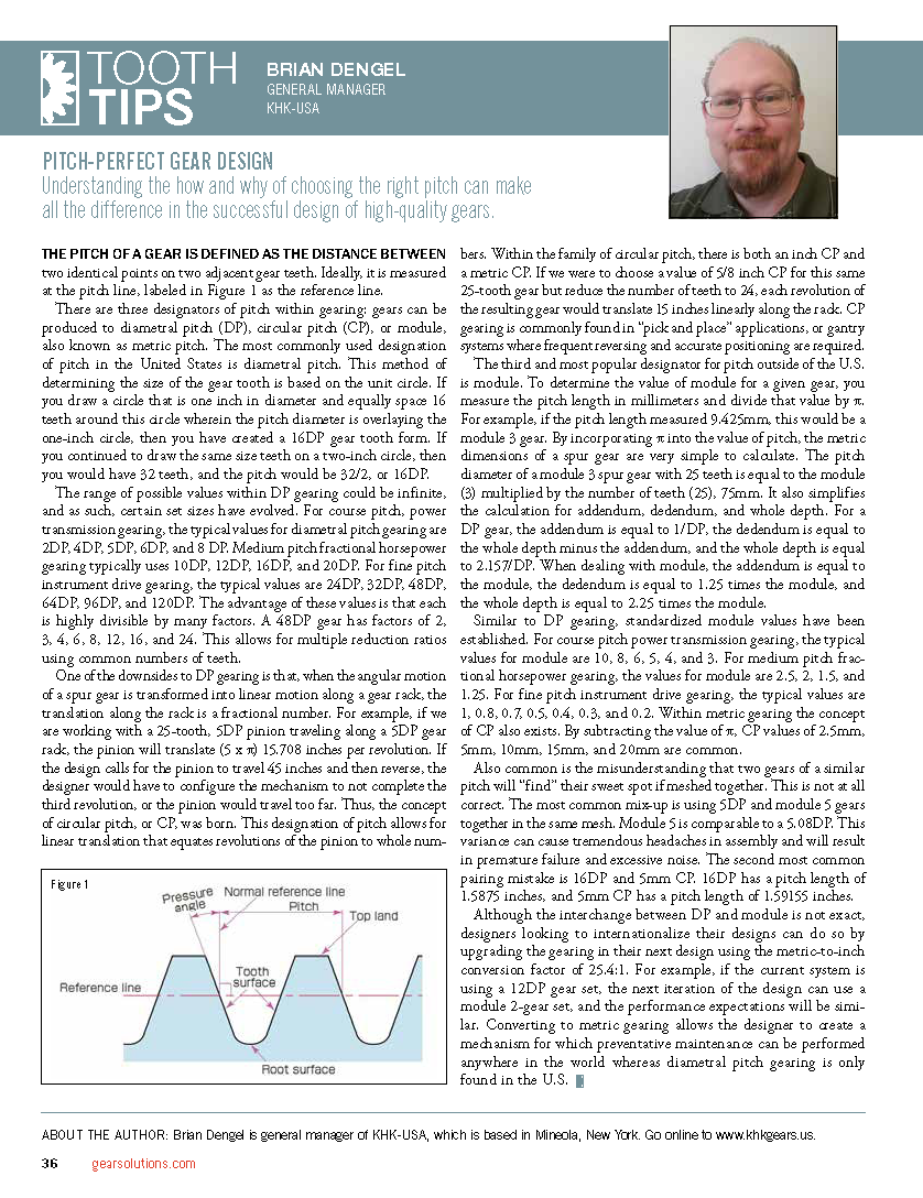There are three designators of pitch within gearing: gears can be produced to diametral pitch (DP), circular pitch (CP), or module, also known as metric pitch. The most commonly used designation of pitch in the United States is diametral pitch. This method of determining the size of the gear tooth is based on the unit circle. If you draw a circle that is one inch in diameter and equally space 16 teeth around this circle wherein the pitch diameter is overlaying the one-inch circle, then you have created a 16DP gear tooth form. If you continued to draw the same size teeth on a two-inch circle, then you would have 32 teeth, and the pitch would be 32/2, or 16DP.